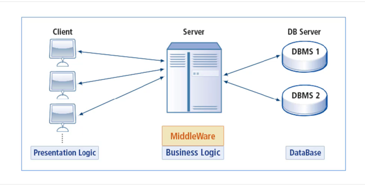 비즈니스 로직을 클라이언트와 DBMS사이의 미들웨어 서버에서 동작하도록 함으로써 클라이언트는 입력과 출력만 담당하도록 합니다.