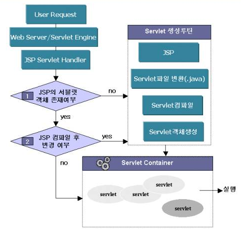 최초로 호출받은 JSP 페이지인지 서블릿 컨테이너에 적재된 서블릿인지를 확인하여 최초로 호출한 것인지 확인하고 최초로 호출한 JSP 페이지이면 JSP 페이지를 서블릿 소스 파일(*.java)을 생성하고, 서블릿 소스 파일을 컴파일하여 서블릿 클래스 파일(*.class)을 생성한 후 서블릿 컨테이너에 로딩한다. 요청한 JSP 페이지가 서블릿 컨테이너에 로딩된 경우에 JSP 페이지가 변경되었다면 다시 서블릿 소스 파일을 생성하고 컴파일하여 서블릿 컨테이너에 로딩한다. 요청한 JSP 페이지의 서블릿을 실행한다. 서블릿은 데이터베이스나 비즈니스 로직들을 처리하고 결과를 클라이언트에 전송한다.