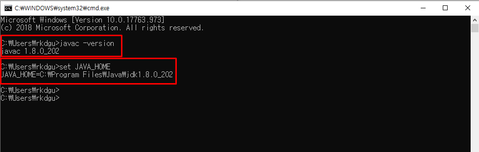 6) 환경설정 잘 됬는지 확인(명령어 javac -version, set JAVA_HOME)