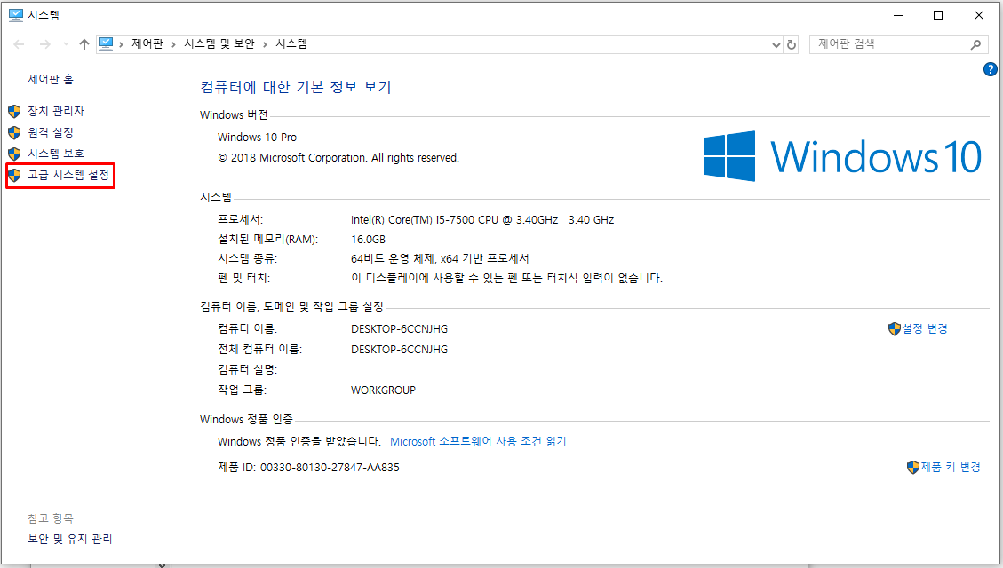2) 고급 시스템 설정 클릭
