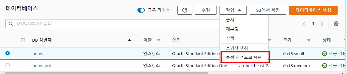 DB 인스턴스 작업중에 특정 시점으로 복원 기능이 있는데 이 역시 자동백업을 세팅 해야지만 가능하고 자동으로 생성된 스냅샷을 이용하여 DB인스턴스를 생성하는 작업이다.