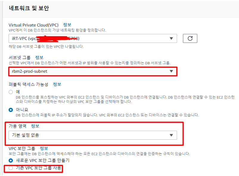 가장 중요한 세팅은 네트워크 및 보안인데 데이터베이스 옵션 에서 옵션 그룹을 기존 인스턴스와 동일하게 하려면 VPC 보안 그룹도 동일해야 한다. 그래야 만들때 오류가 안난다.