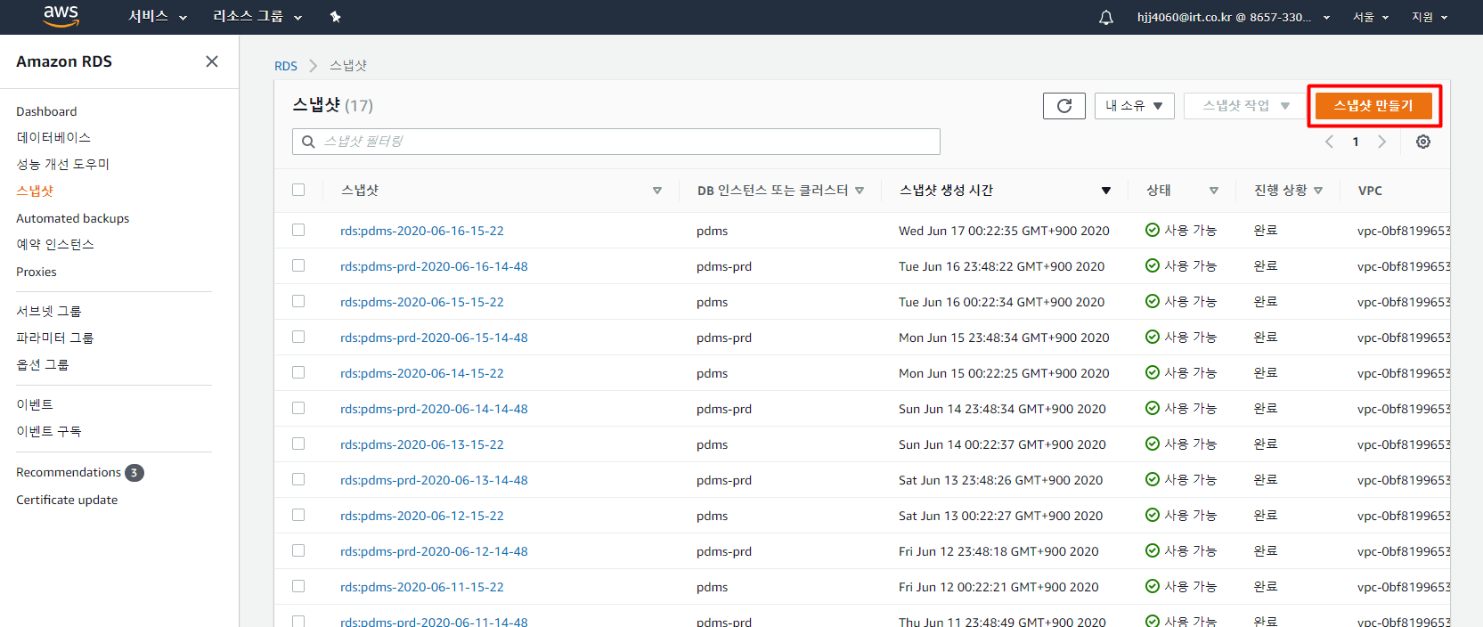 스냅샷 만들기 버튼을 클릭하면 아래처럼 만들어진다. 만들면 첨에는 상태가 생성 중으로 표시되고 5분정도 지나면 사용가능으로 바뀐다.