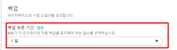자동백업 세팅은 인스턴스 생성할때 백업메뉴에서 할 수 있으며, 보존기간은 최소 1일부터 최대 35일까지 세팅할 수 있다. 자동 스냅샷은 매일 생성되며 보존기간만큼 보관된다.