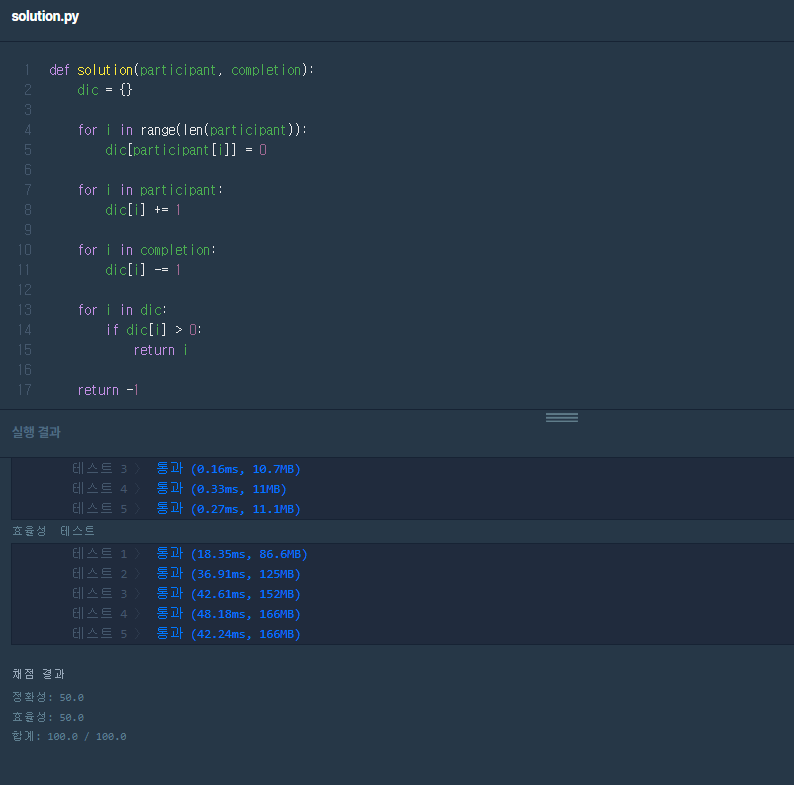 위 방법으로 테스트를 통과했지만 이 문제가 해시 문제인걸 봤을때 해시로 어떻게 풀지 생각해 봐야 한다.