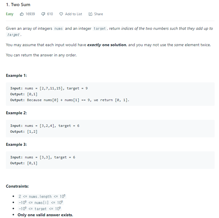 문제는 Input nums 정수형 리스트와 이 리스트로 만들어야할 값 target이 있고 리스트에서 target을 만들 수 있는 인덱스 2개를 구하면 된다.
