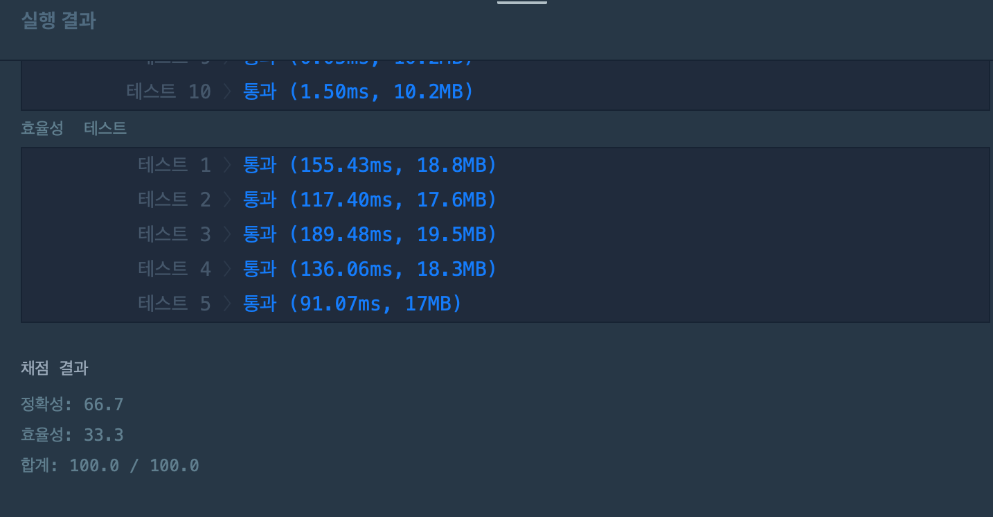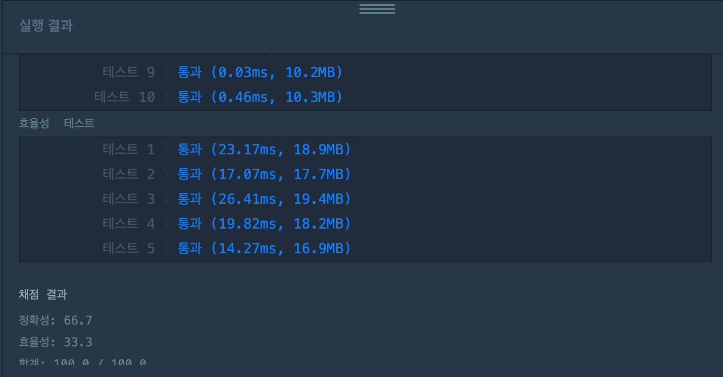 Brute force는 시간이 100~200ms 였지만 스택을 이용하니 시간이 50ms 아래로 떨어졌다. 스택을 이용하니 시간 효율성이 좋아진걸 확인할 수 있었다.