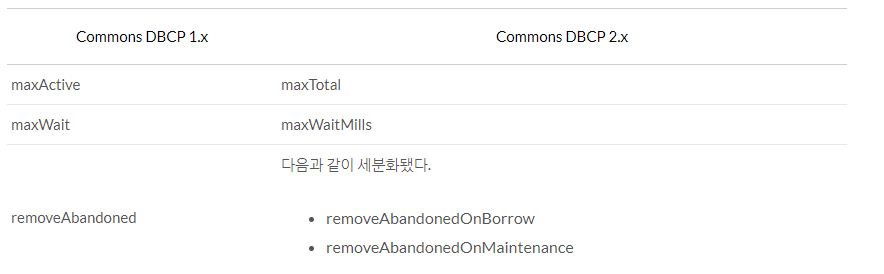 [DBCP1.x와 DBCP 2.x의속성이름 차이]