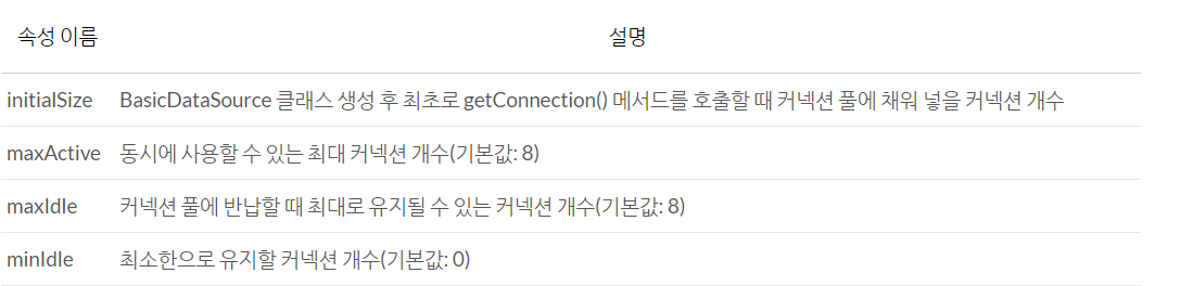 [DBCP 대표적인 속성과 설명]