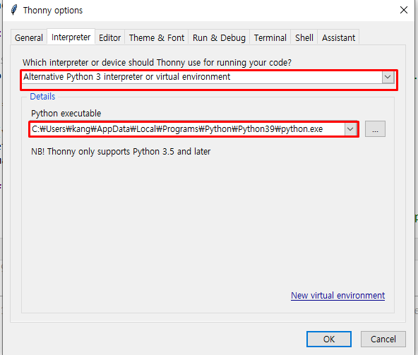 다 설치 후 Thonny를 연다. 그리고 option창 Interpreter 탭에서 python.exe 실행 경로를 지정해줘야 한다. 그래야 위에서 설치한 모듈을 사용할 수 있다.