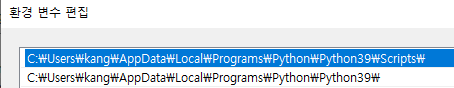 환경변수가 아래처럼 python홈, python홈\Script 가 돼 있어야 한다.