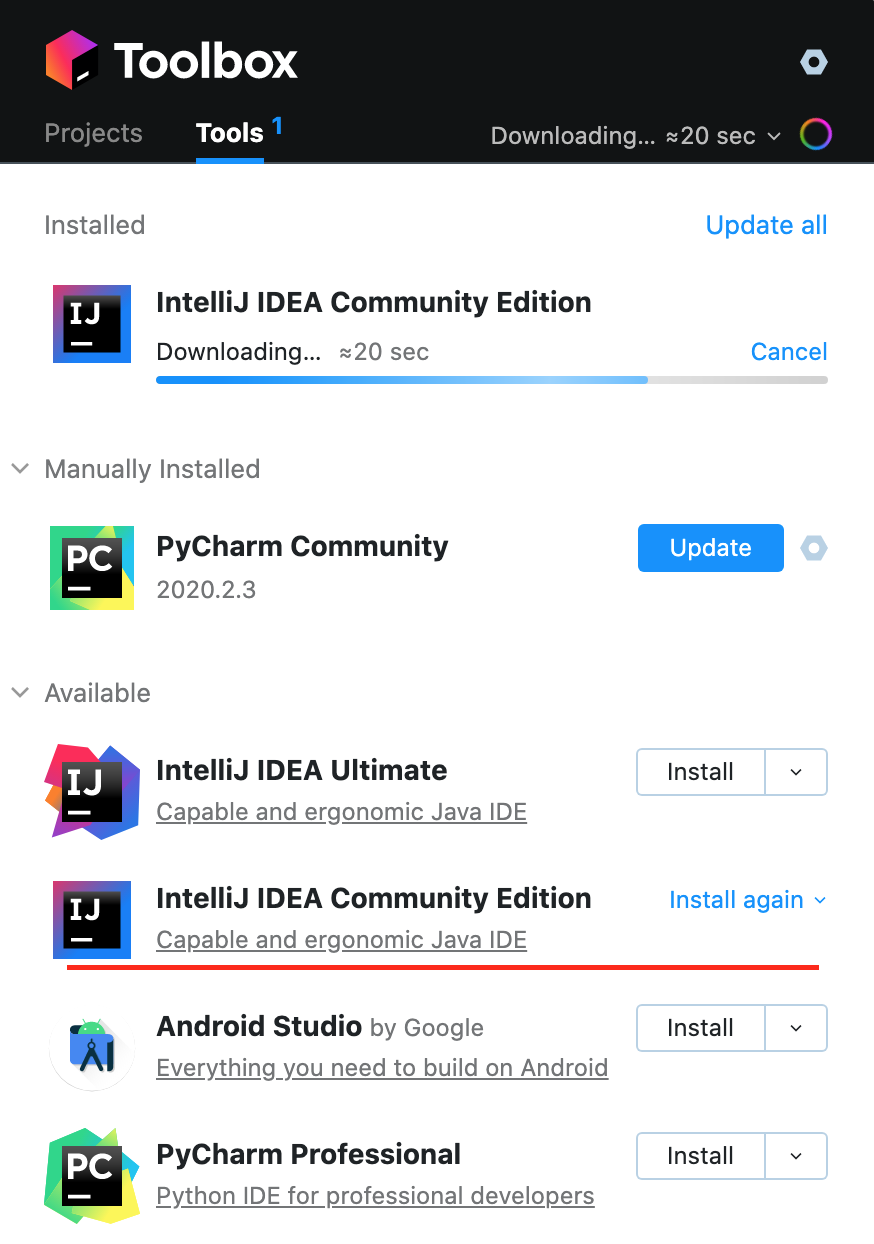 2. 툴박스를 실행시켜 IntelliJ를 설치할 수 있는데 Ultimate 버전은 유료 버전이고 Communitity 버전이 무료 버전이기 때문에 Community버전을 다운로드 한다.