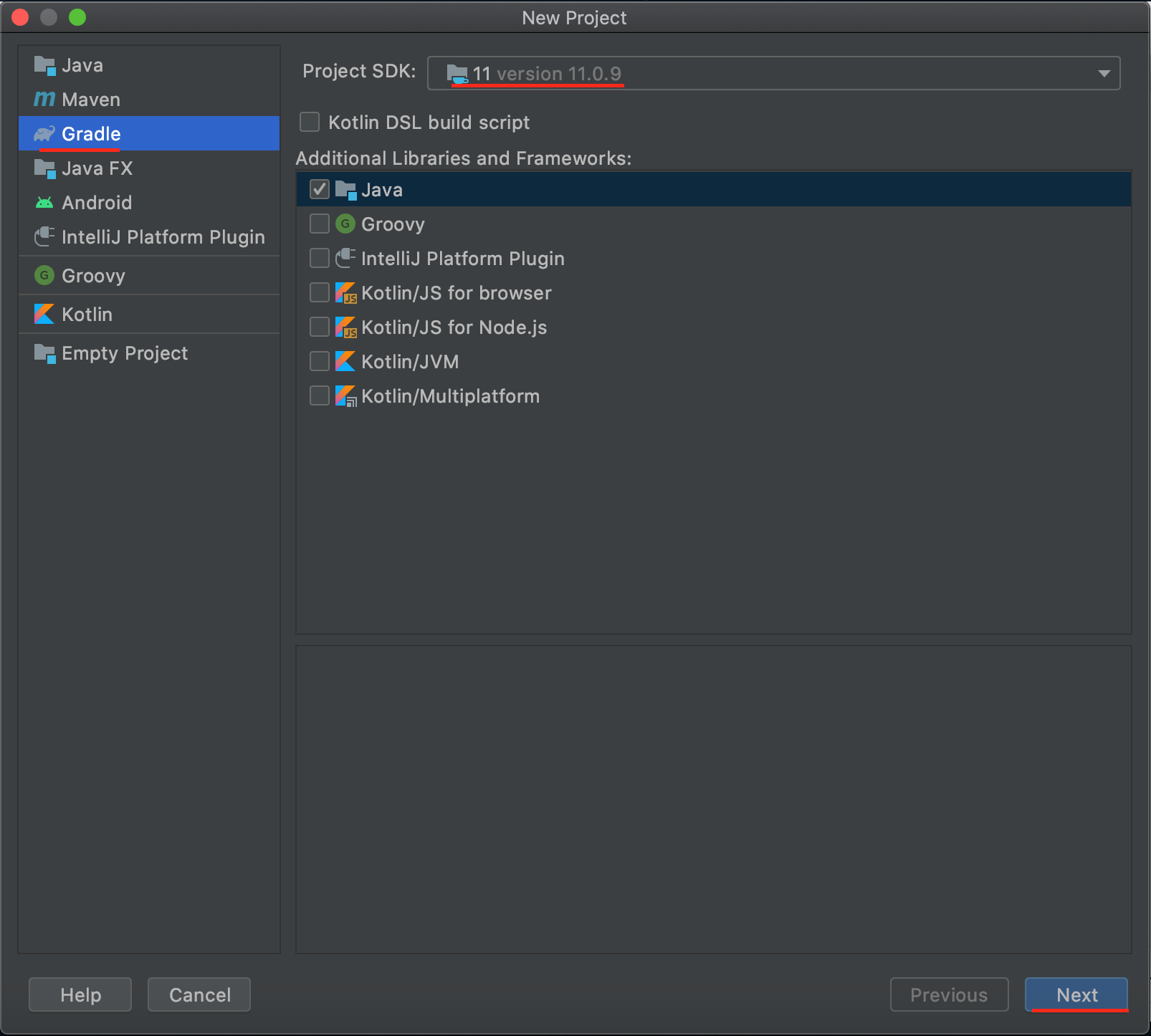 설치 완료 후 New Project에서 Gradle 선택 후 Next 클릭
