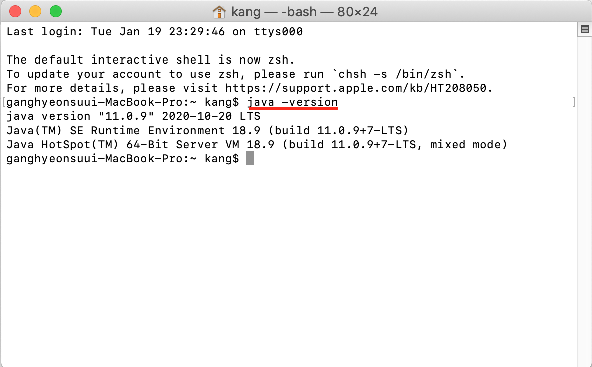 2. 설치 후 terminal.app 에서 java -version 을 치면 다운로드 됐는지 확인