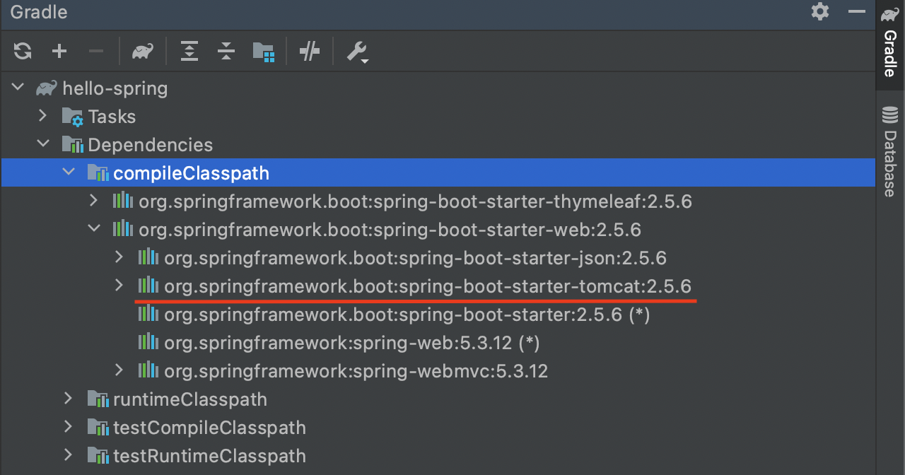 그리고 spring-boot-starter-web 라이브러리를 땡겨올때 자동으로 톰캣 라이브러리를 가져오기 때문에 톰캣 설치없이 웹서버를 띄울수 있는것이다.