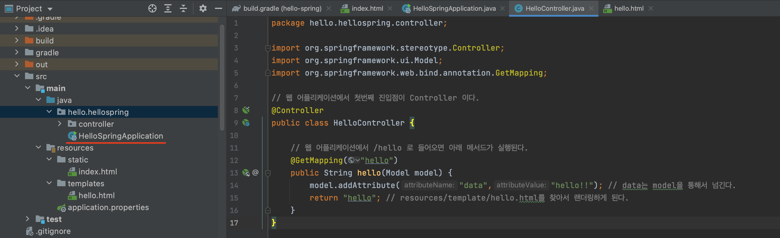 웹 어플리케이션은 Contoller를 통해서 화면이 나오는데 @Contoller 를 통해서 화면을 조회할수 있게 된다.
