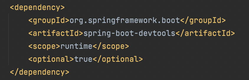 DevTools를 처음 스프링부트 프로젝트를 만들면서의존성을 지정할때 Spring Boot DevTools를 선택하면 아래처럼 pom.xml파일의 <dependency> 요소에 지정되어 있다.