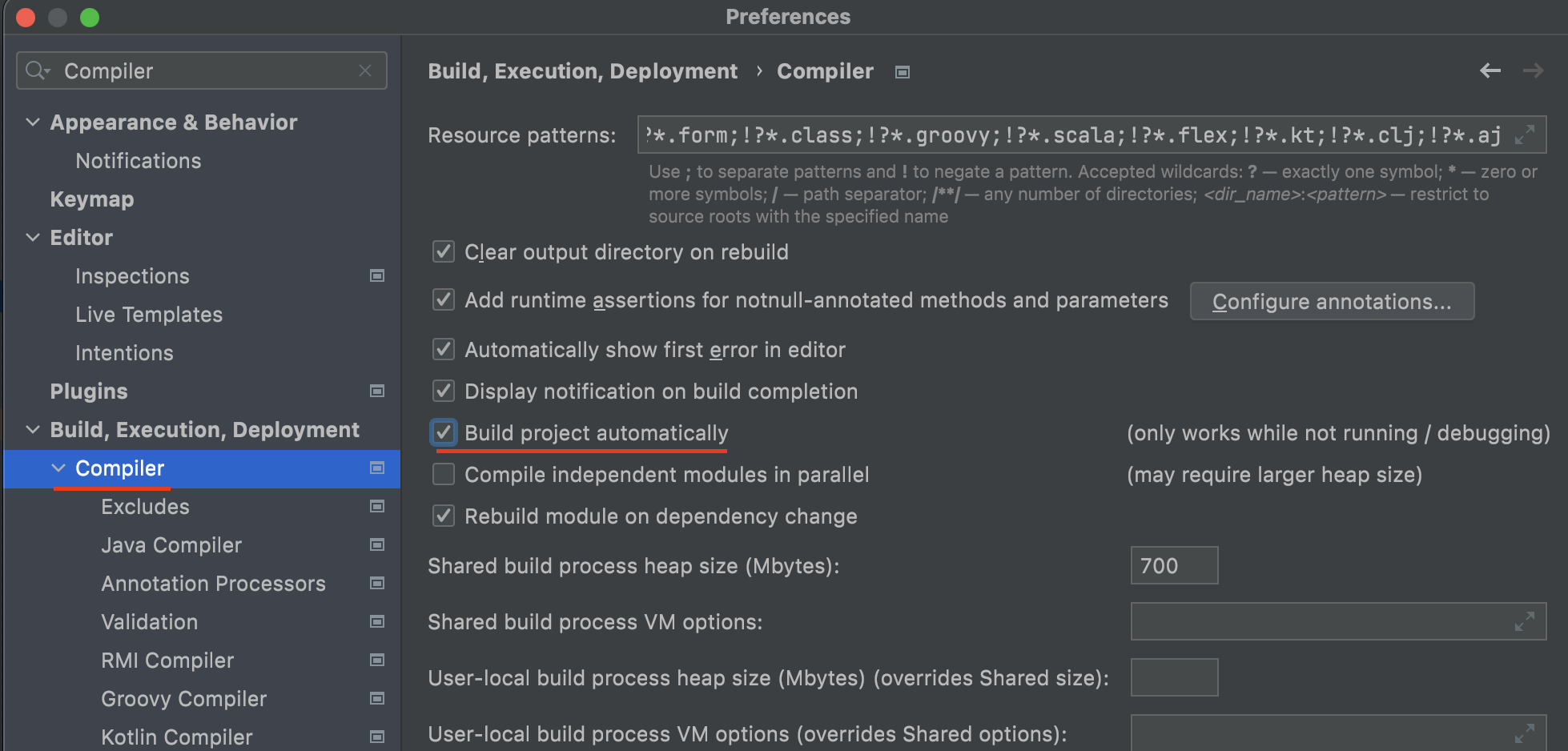 Perference에서 Compiler를 검색후 Compiler 설정창에서 Build project automatically 체크