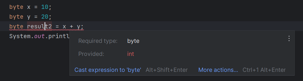 그래서 아래 예제를 보면 x, y 는 타입이 byte인데 x+y는 int 타입에 저장하라고 한다.