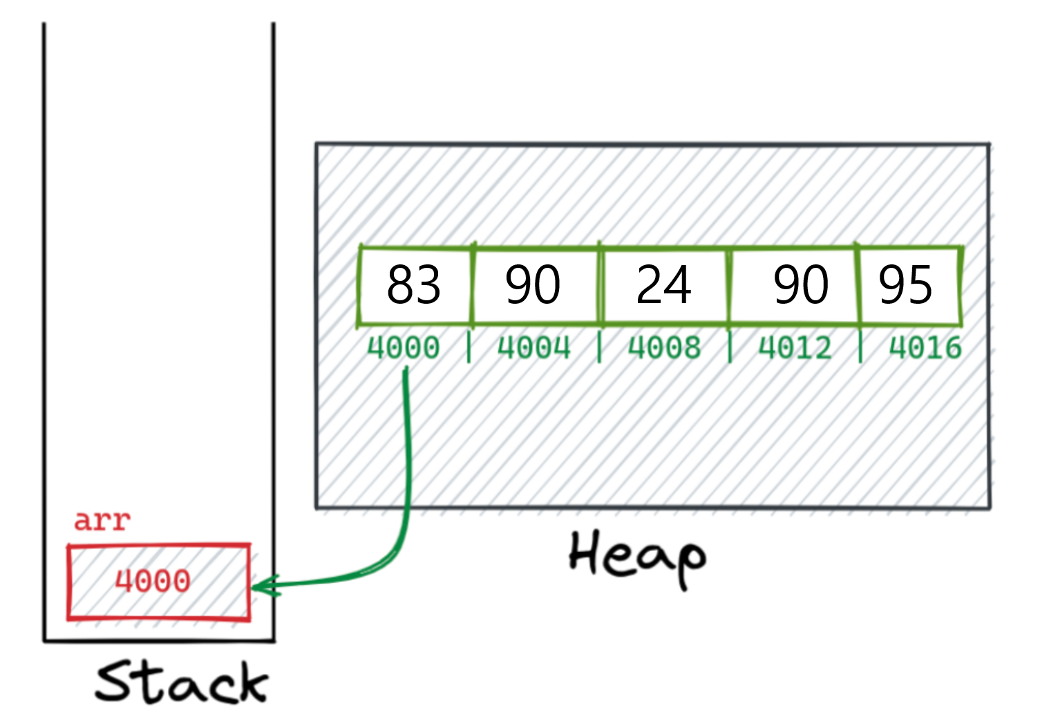 스택안에 있는arr는 scores1이다 그 안에 heap사이즈에 생성된 배열주소의 첫번째 인덱스만 주소를 가져오고 힙사이즈 안에있는 배열은 주소가 4씩 차이가 난다. 4가 차이나는 이유는 int는 4byte이기 때문이다 즉 첫번째 인덱스만 스택에 가지고있고 인덱스 2번의 주소를 가져올때는 int가 4byte이니 4000 + 8이 붙어 4008의 주소값을 가져오기 때문에 인덱스로 데이터를 가져올 수 있는것이다. 만약에 char 형 배열이였으면 char는 2byte이니 2번째 인덱스는 처음 주소값 + 4가 되어 4004의 주소값을 참조했을 것이다.