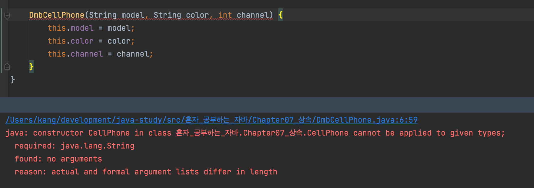 또 주의사항으로는 부모 클래스의 생성자가 접근제한자 private를 사용한다면 부모클래스의 생성자를 자식클래스에서 만들수 없기 때문에 에러가 발생한다.