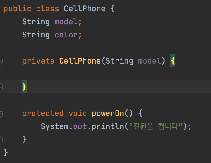 CellPhone 클래스의 model, color 필드와 powerOn() 메서드를 상속 받았기 때문에 사용할 수 있다.