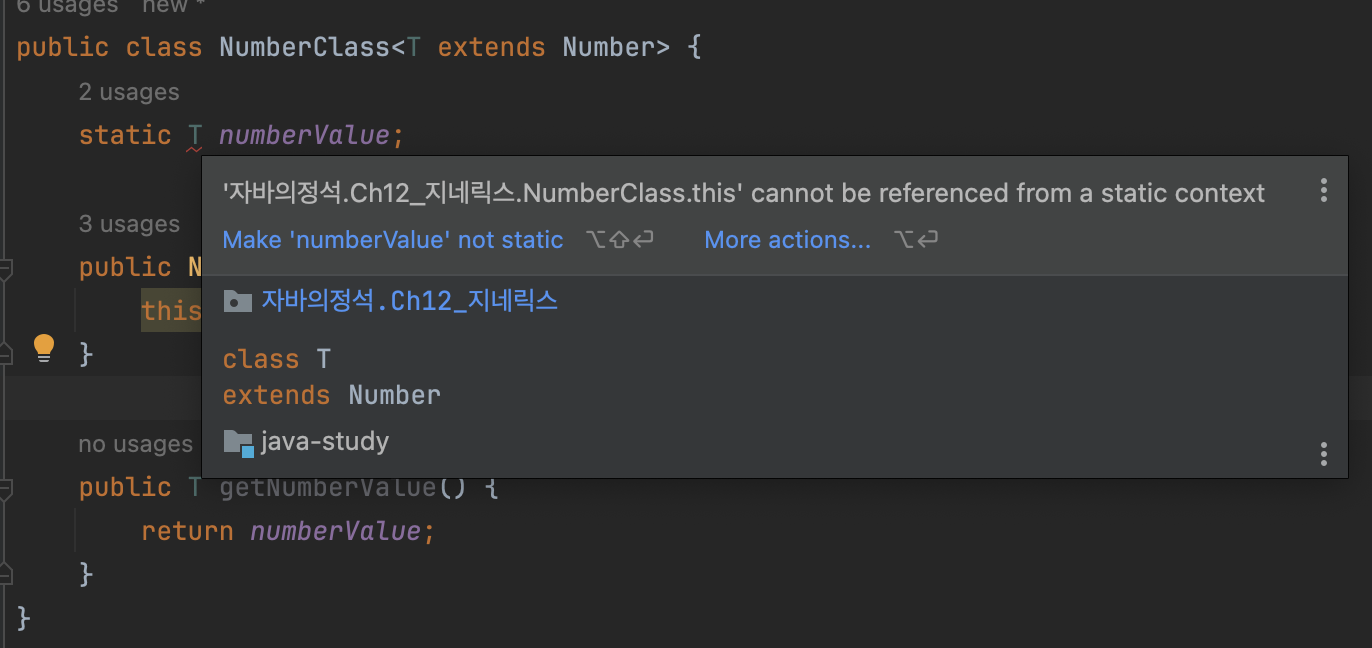 <T extends Number> 선언으로 T 타입은 Number 클래스의 하위 클래스 타입만 가능하다는 뜻이다.