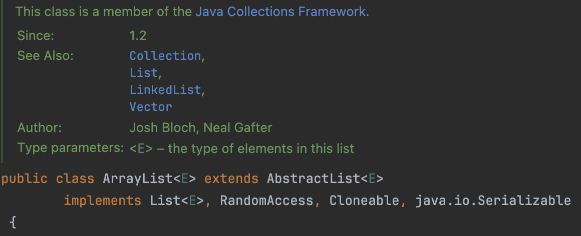 타입변수는 일반적으로 제네릭스를 사용하는 ArrayList, Set 등 컬렉션에서 볼 수 있는데, 아래 보이는 <E> 가 타입 변수다.