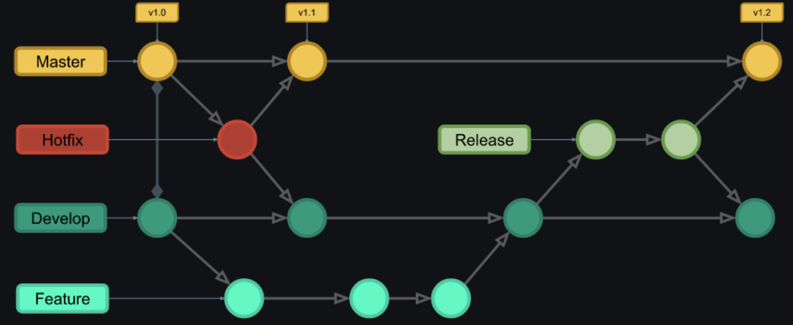 - 기능 개발을 진행할 때 develop 브랜치를 기준으로 feature 브랜치를 만들어서 기능개발을 완료
