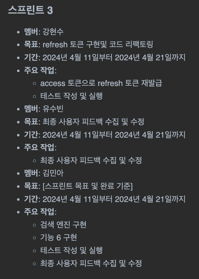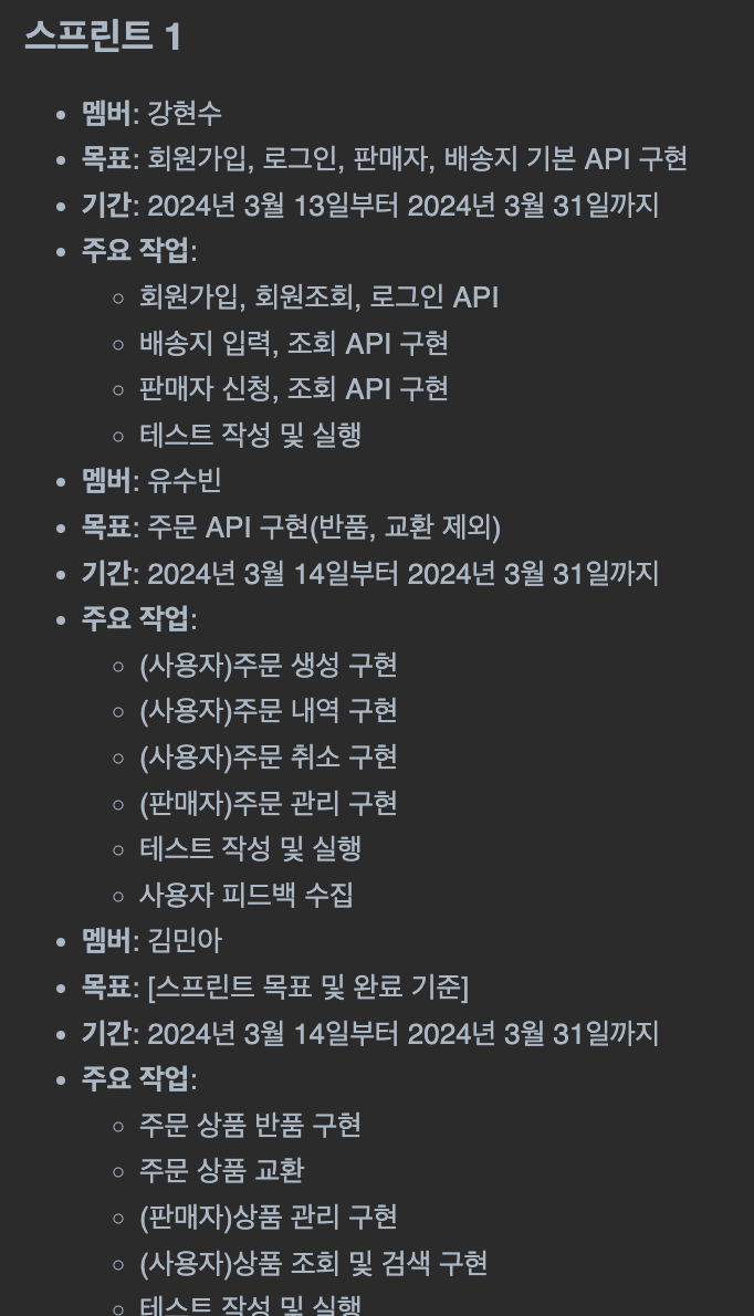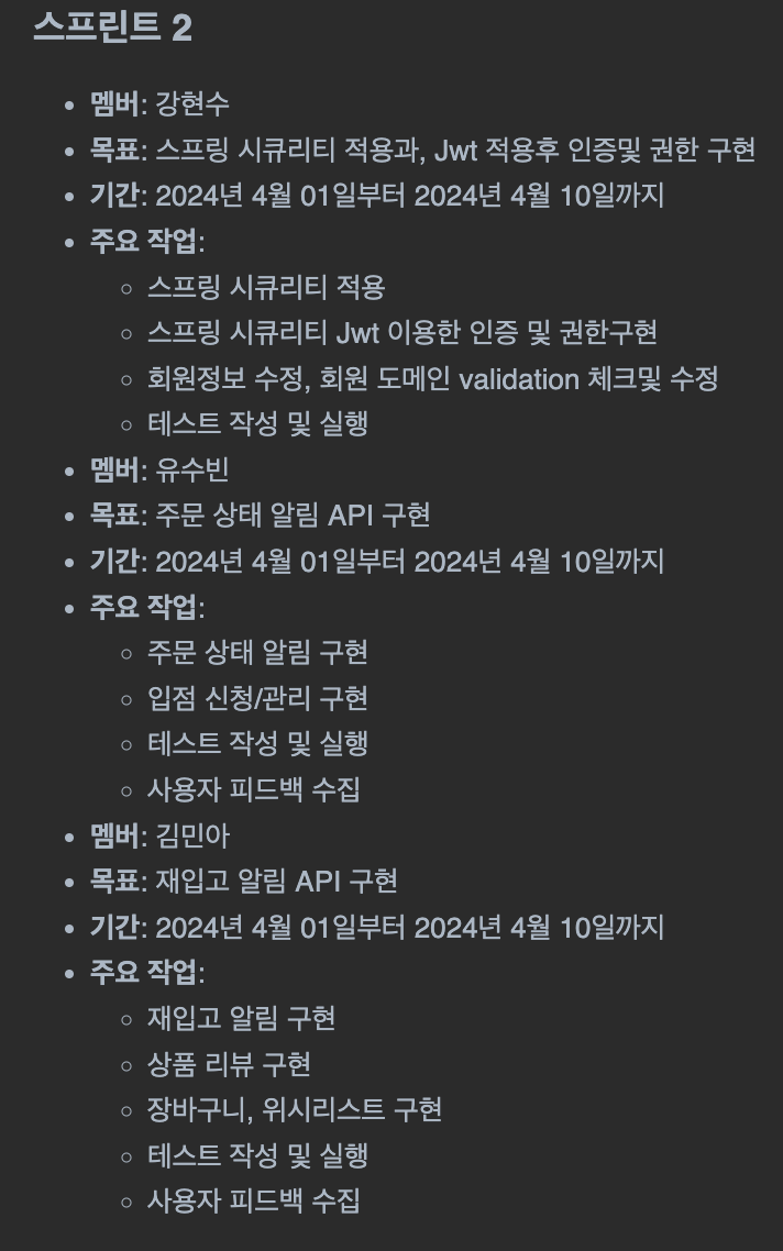 우리 팀은 3월 중순부터 4월 중순까지 2달에 거쳐서 옷 쇼핑몰 팀프로젝트를 하였고 설계(백로그 작성)를 1주간 한 후 2주 단위 3개로 스프린트를 나눴다.