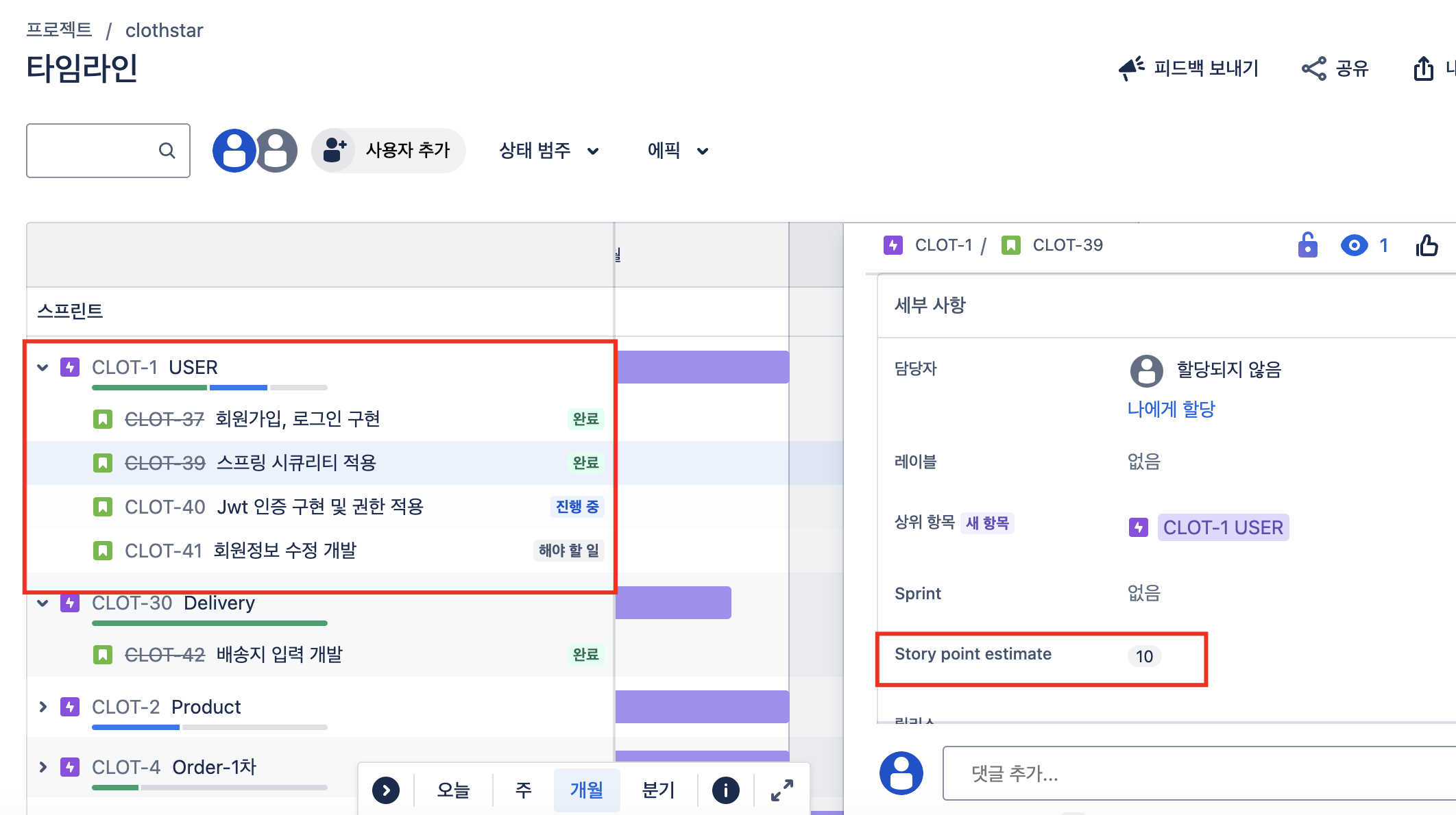 Epic은 일 전체에서 사용자의 단위이다. 그래서 도메인 이름으로 하였고 Story는 Sprint를 한층 더 세분화한 작업 Story Point는 각 Story마다 부여한 작업 난이도다 주관적으로 판단한 작업 난이도나 기한으로 Story Point를 1~10 점수를 매겼다.