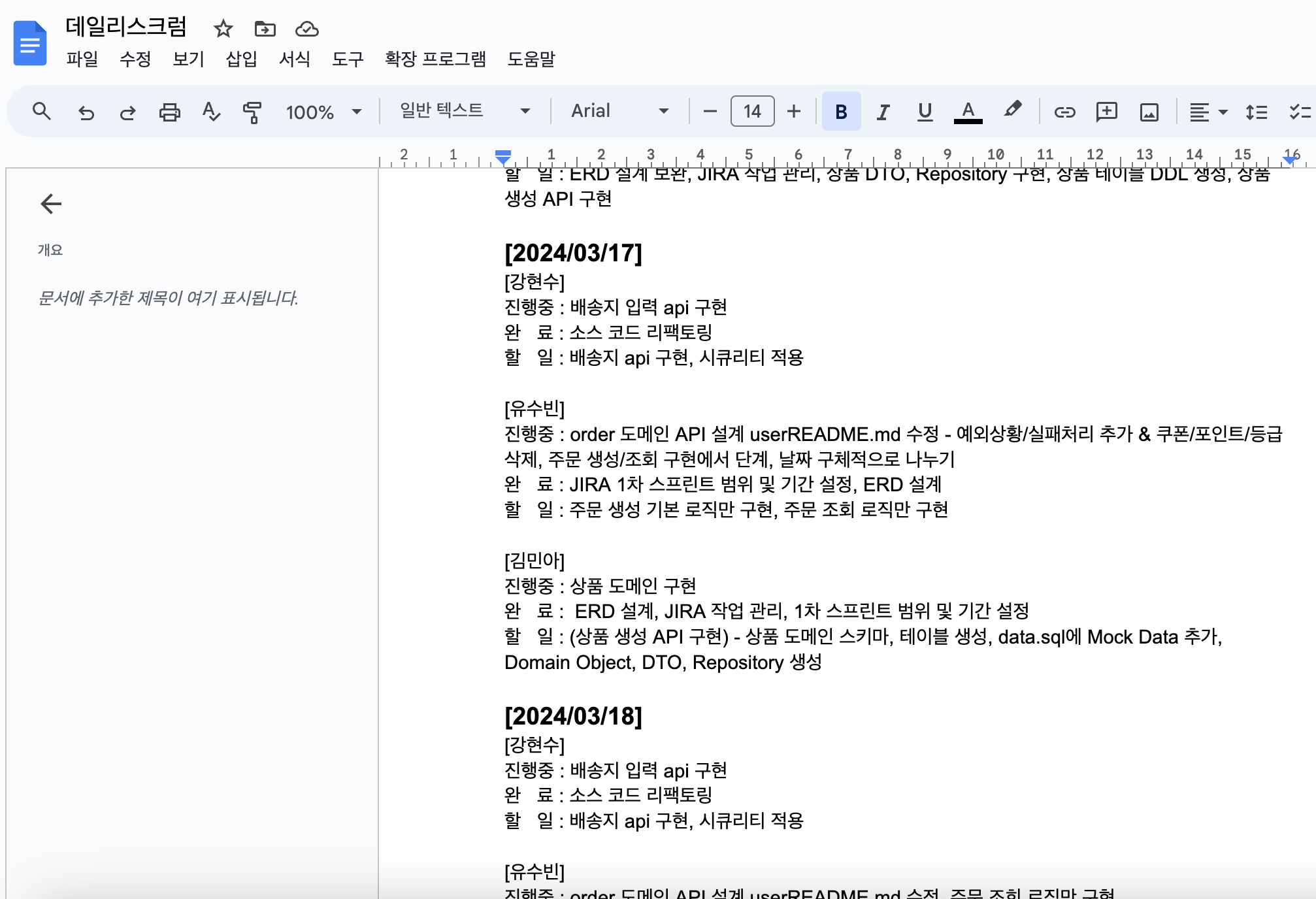 그리고 Daily Scrum은 하루하루 저녁에 보이스 채팅을 하여 팀원별로 구글 독스에 진행 중인 작업과 완료한 작업 내일 할 작업을 정리를 하였다.