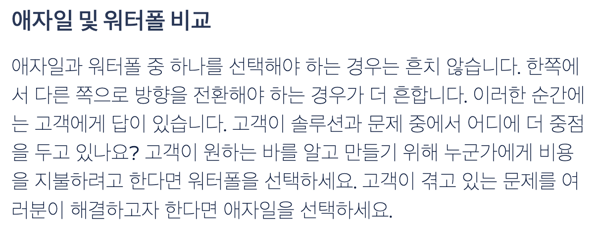 참고 : Attlasian 공식문서에는 고객이 원하는 정확히 알고 있을 때는 워터풀 방식을 선택하고, 고객이 겪고 있는 문제를 해결하자고 한다면 애자일을 선택하라고 권장하고 있다.