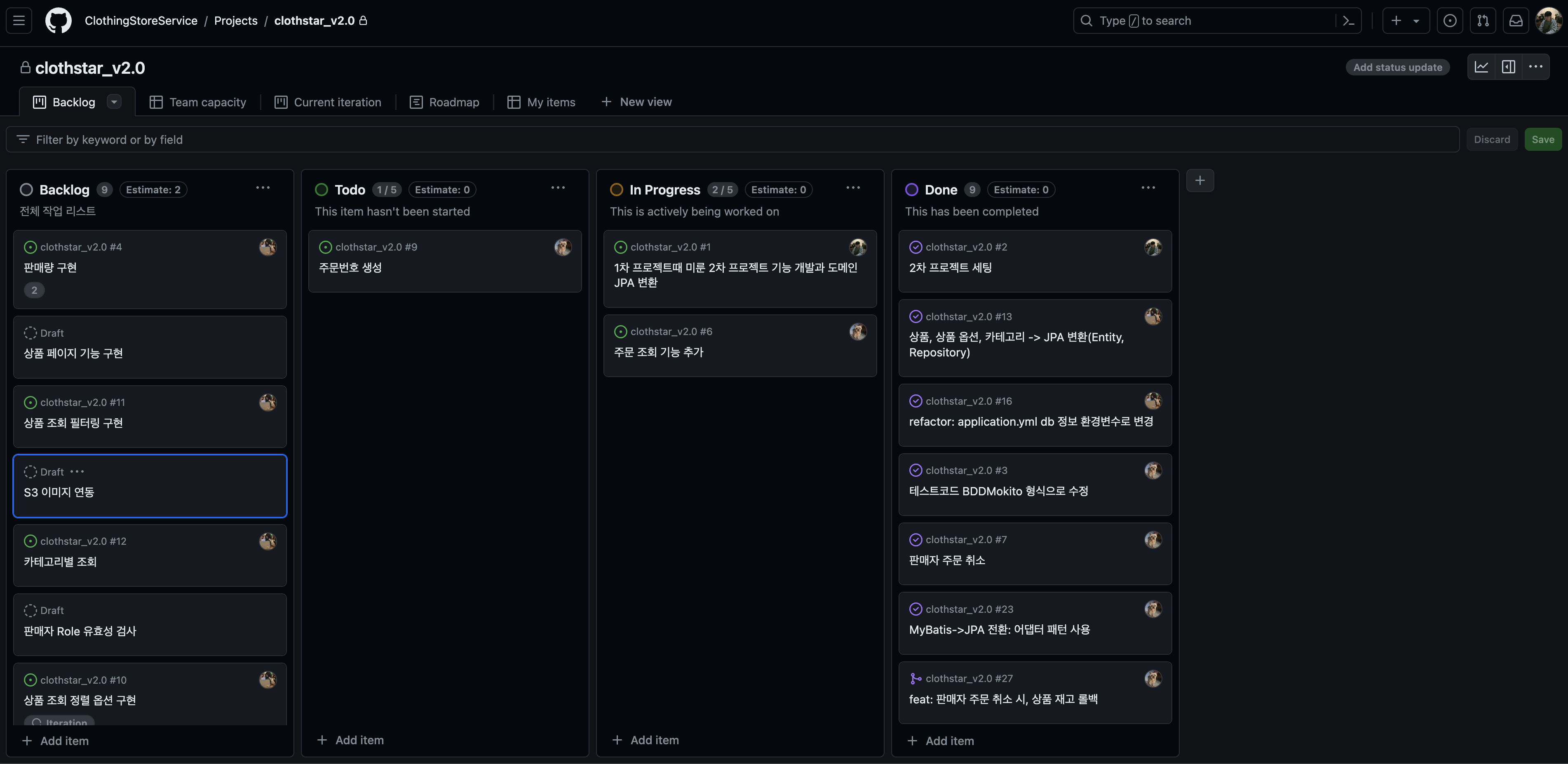 Github의 Project에서 칸반식으로 Backlog에 전체 이슈(작업)을 두고 곧 해야할 작업, 진행중인 작업, 끝낸 작업을 나눠서 한눈에 보도록 하였다.