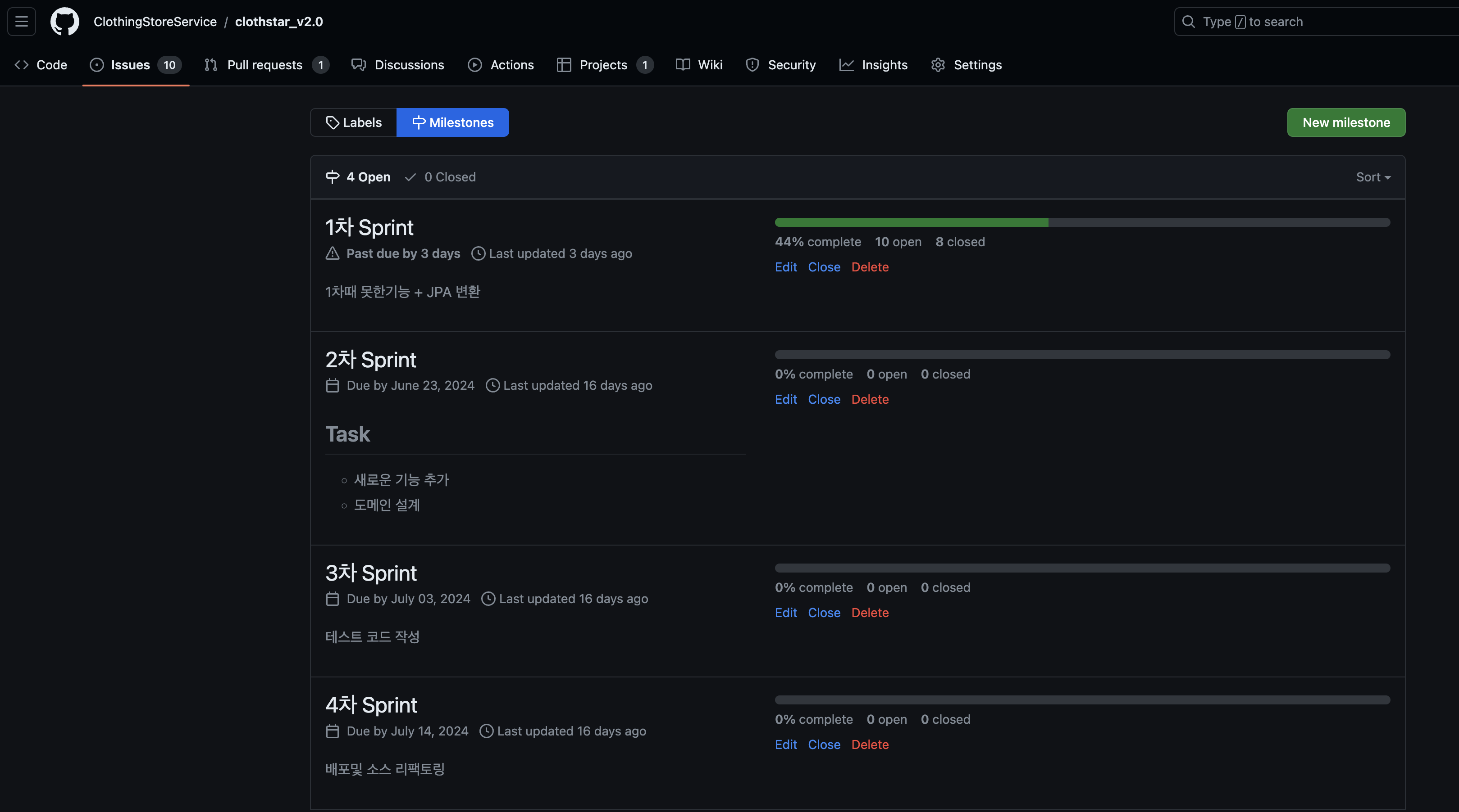 issues의 Milestones에서 크게 4단위로 Sprint를 나눴다. issue들을 이 sprint에 매핑을 시켜서 어디까지 작업이 됐는지 확인할 수 있다.