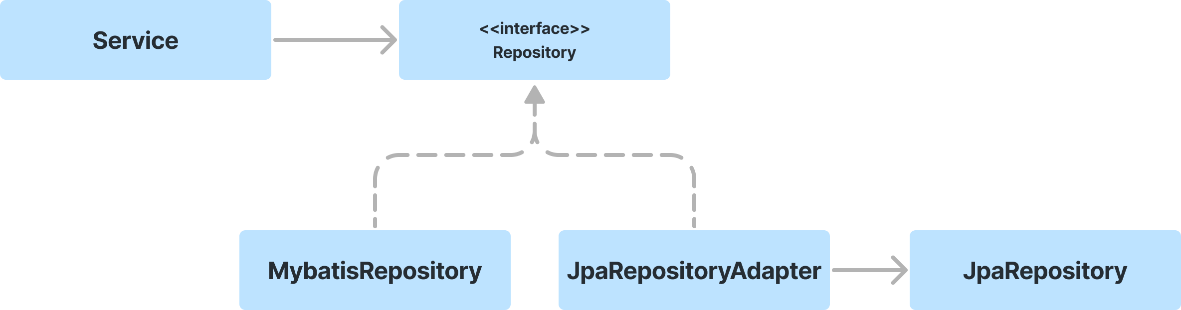 Adapter가 낀 이유는 MybatisRepository와 반환타입이 다르기 때문이다. 반환타입을 맞춰주기 위해서 어댑터 패턴을 적용하였다. 위처럼 적용하면 Service가 Repository를 의존하여 고수준이 고수준을 의존하도록 변경하였고 MybatisRepository, JpaRepository도 추상화 된 Repository를 의존하게 하여 DIP 원칙을 지켰다.