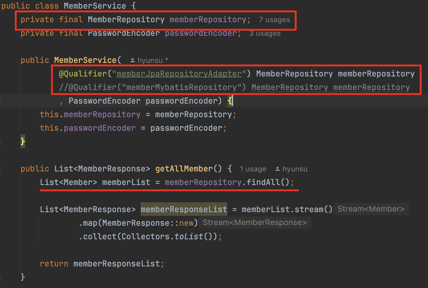 수정된 아래 코드를 보면 @Qualifier를 변경해서 Repository 구현체의 변경만 해주면 아래 서비스 로직들이 한번에 변경이 된다. 이러면 Mybatis와 Jpa의 변경이 쉽게 이루어져 유지보수가 편해졌다.