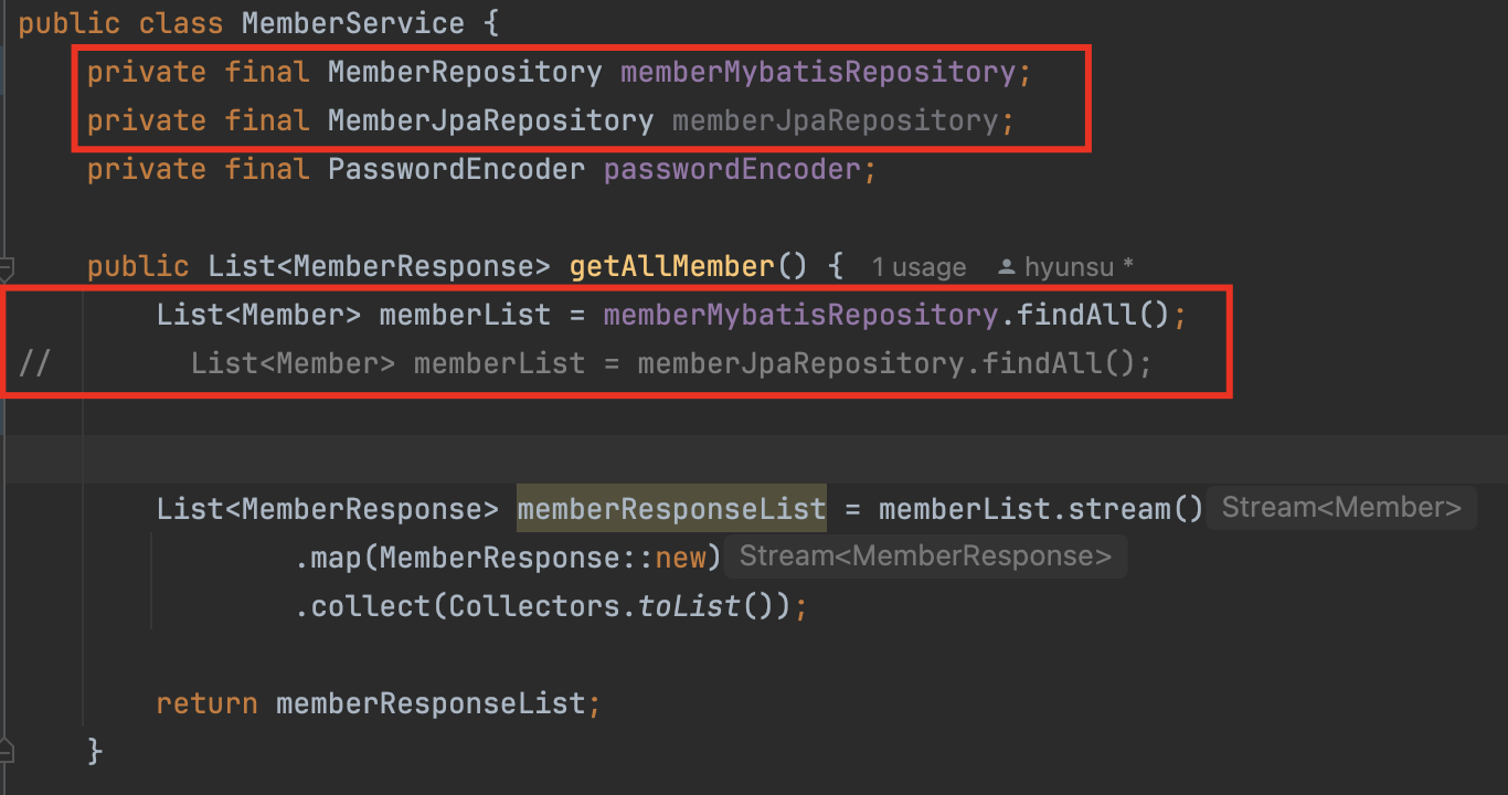 예를 들어 아래 소스를 보면 member도메인에 대한 MybatisRepository와 JpaRepository가 있는데 findAll()로 memberList를 가져온다고 했을때 Service의 비즈니스 로직이 바뀌어 버린다. 또 반환타입도 달라서 밑에 MemberResponse List로 변환해주는 로직도 변경해야 한다. 고수준 Service가 저수준 MybatisRepository, JpaRepository를 직접 의존하고 있기 때문에 코드 변경과 전환이 힘들것이다. 좋은 설계는 Mybatis와 Jpa의 변경이 쉽게 이루어져야 한다.