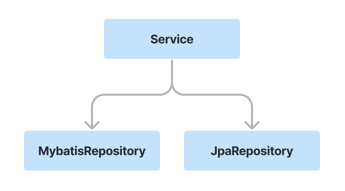 하지만 위 설계는 DIP를 위반한 것이다. 왜냐면 고수준 Service가 저수준 MybatisRepository와 JpaRepository를 직접 의존하기 때문이다.