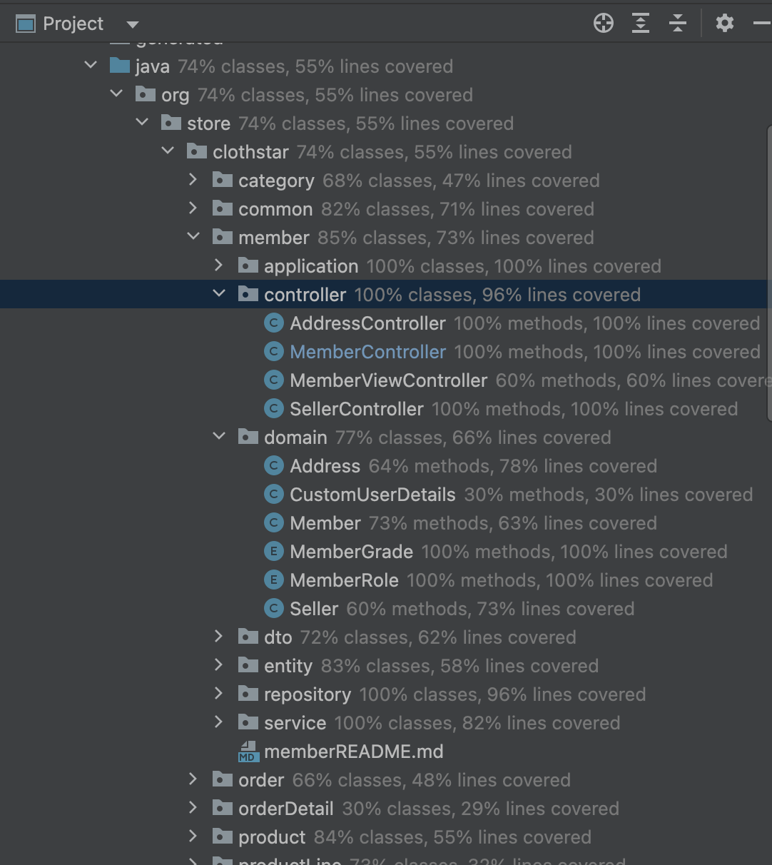 테스트 커버리지는 단순히 테스트코드에서 메서드가 사용되거나 필드가 사용된다. 옳바른 테스트 코드 로직을 작성하는것이 더 중요해서 커버리지 %가 꼭 높다고 좋은것이 아니다. 그래도 기본적으로 최소 70% 이상은 넘겨야된다.