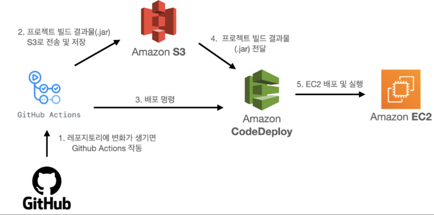 Github Actions 빌드 배포 플로우는 Github Actions를 작동시켜서 빌드 결과물 jar 파일을 S3에 전송한다. 그리고 S3에 있는 jar파일을 CodeDeploy가 EC2에 배포 해서 실행 시킨다.