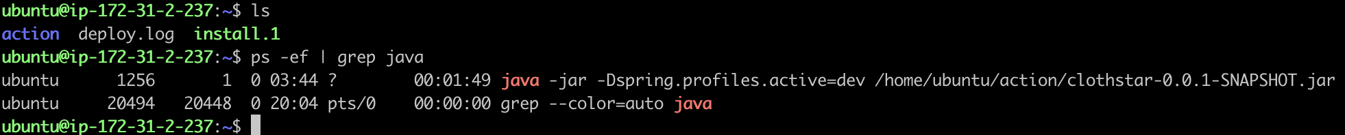 그리고 자동배포시 springboot가 kill 되고 재시작이 됐는지 알려면 ~/deploy.log를 tail -f deploy.log 해서 확인하면 된다.
