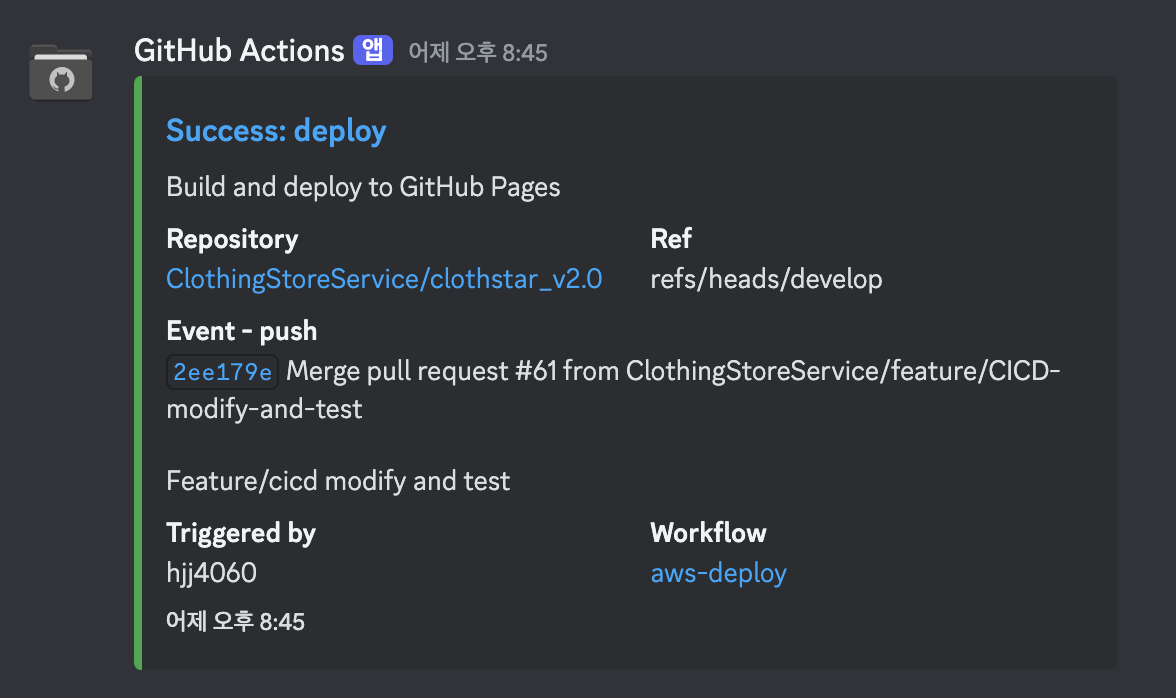 보통 알림설정은 노션에 하지만 디스코드에 깃허브 알림을 설정해놔서 배포 알림도 디스코드에 같이 하는게 좋을거같아서 디스코드에 했다.