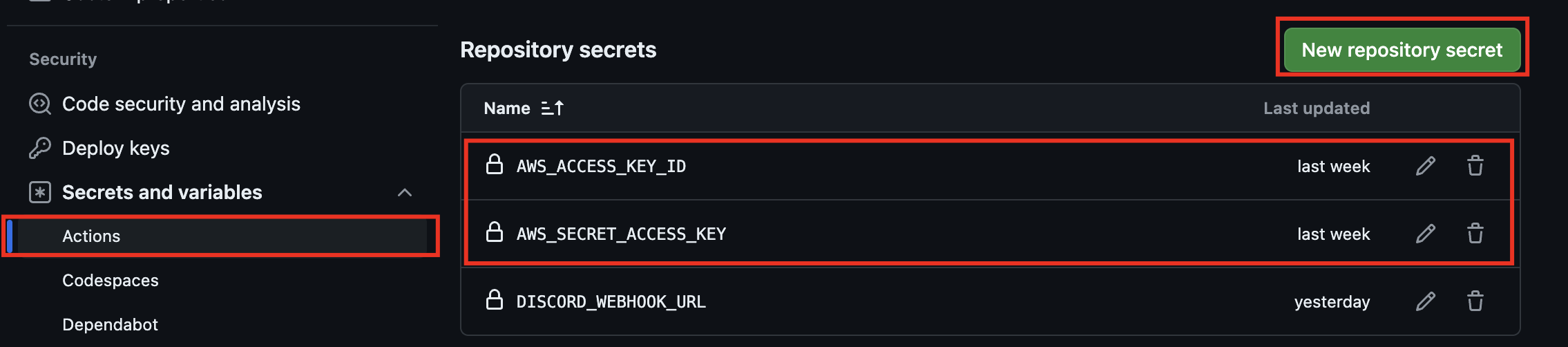 ${{ secrets.AWS_ACCESS_KEY_ID }} 와 ${{ secrets.AWS_SECRET_ACCESS_KEY }} 는 secrests의 AWS_ACESS_KEY_ID와 AWS_SECRET_ACCESS_KEY의 변수 값을 사용한다는 뜻이다. 깃허브의 settings에 들어가서 Secrets and variables > Actions 탭에서 New repository scret 버튼을 눌러서 값을 추가할 수 있다.