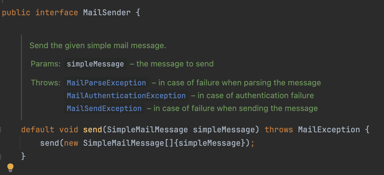 JavaMailSender의 send() 함수로 메일을 보내다 에러가 생기면 RuntimeException인 MailException이 발생한다.