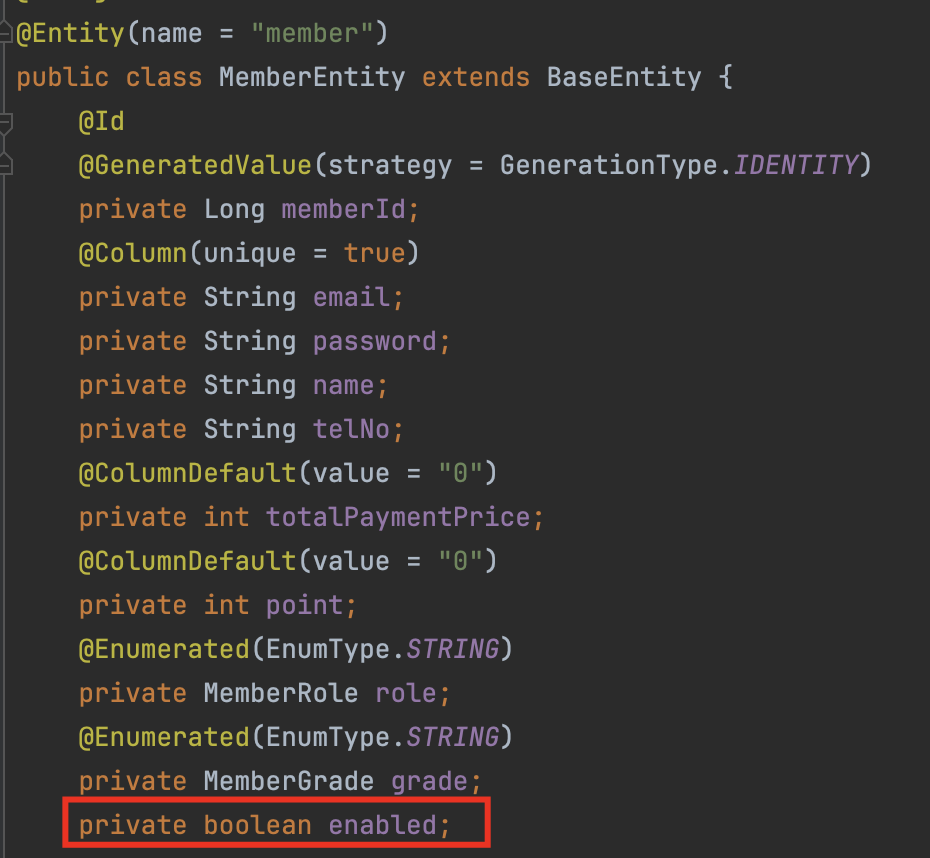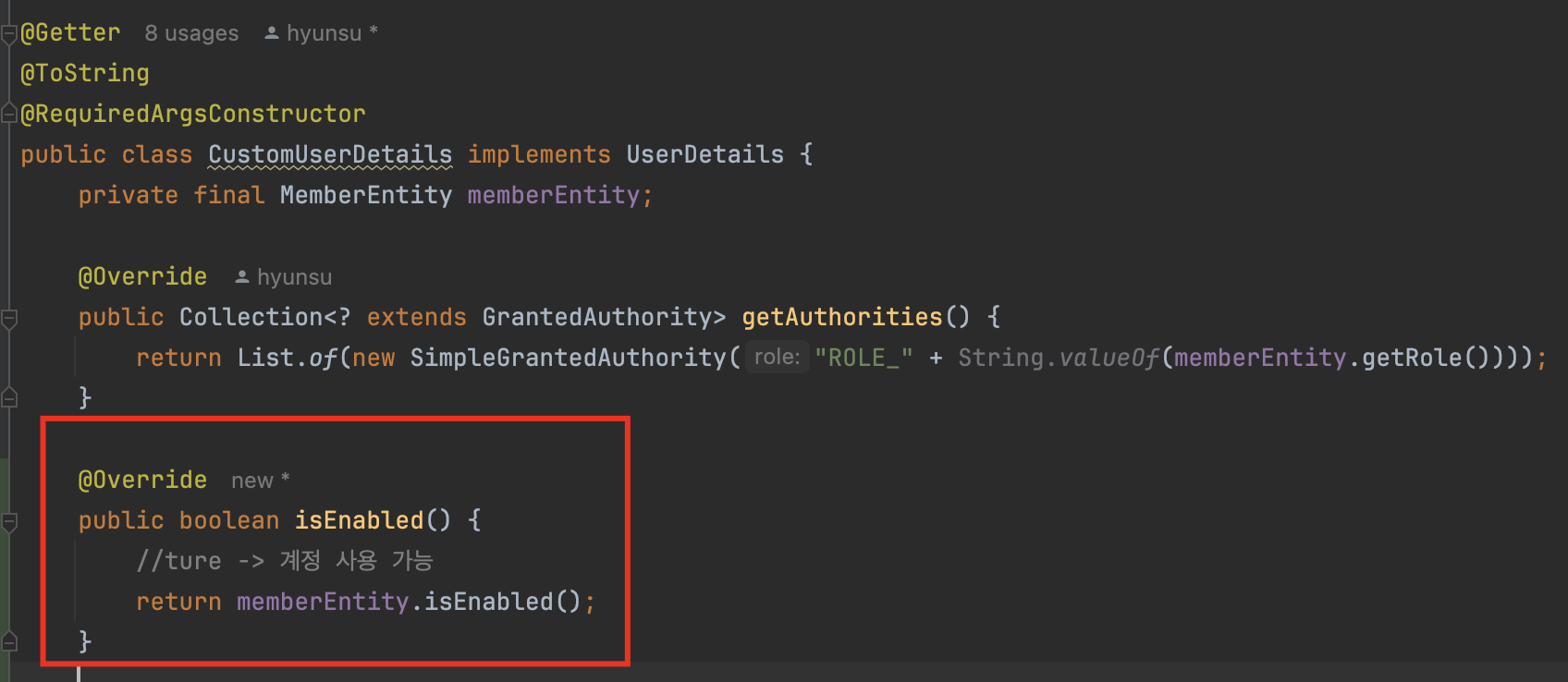 이어서 entity에 enabled 필드를 추가하고 UserDetails를 상속받아 구현한 isEnabled()에 enabled 값으로 활성화 비활성화 여부를 결정한다.