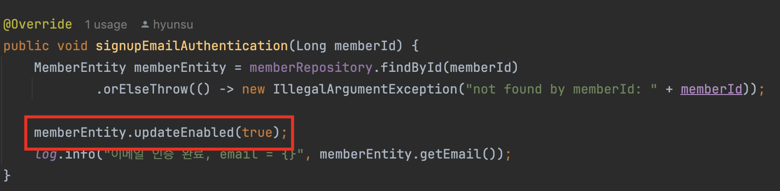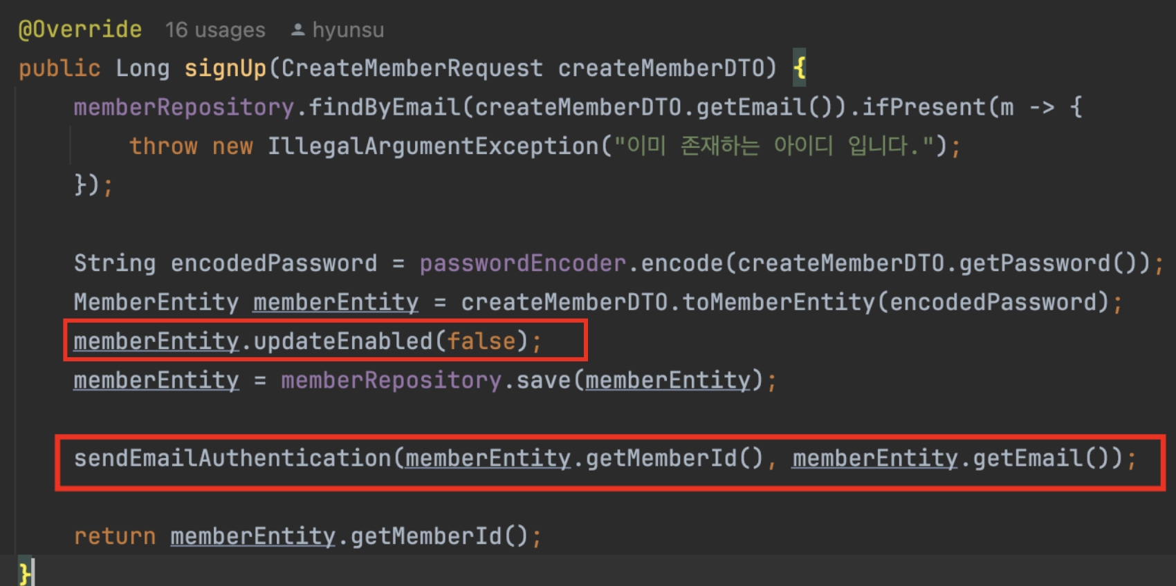 회원가입시 memberEntity의 필드 enabeld의 값을 false로 세팅하고 회원을 db에 저장한 다음 메일을 전송한다.