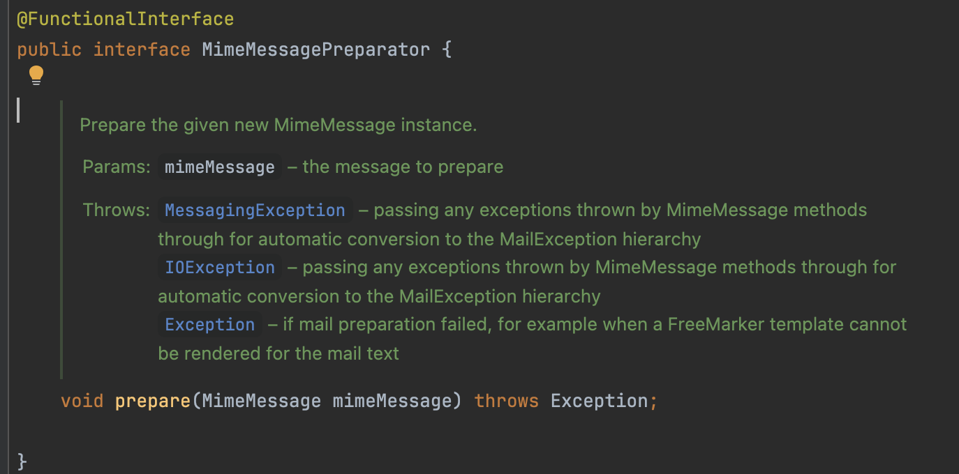MimeMessagePreparator는 MimeMessage 객체를 만들 수 있는 함수형 인터페이스이고 메일 메시지를 준비를 람다식으로 만들어서 코드의 가독성을 올릴수있다.