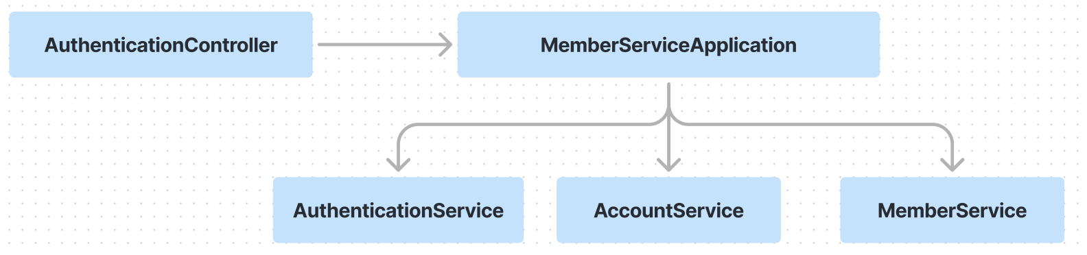 하나의 서비스에서 여러개의 서비스를 나눴을때 여러개의 서비스를 실행시켜주는 매개체 역할이 필요한데 그것이 위에서 MemberServiceApplication이다. 이것이 퍼사드와 같은 역할을 해줘서 퍼사드 패턴이 될수있다.
