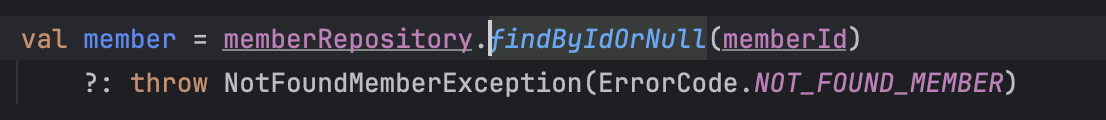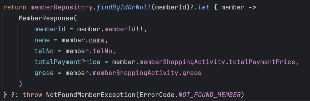아래 코드는 memberRepository 에서 Id값으로 객체를 불러왔을때 객체 값이 없으면 MemberResponse로 타입을 변환시키고 그게 아니면 NotFoundMemberExcetpion을 발생시키는 코드이다.